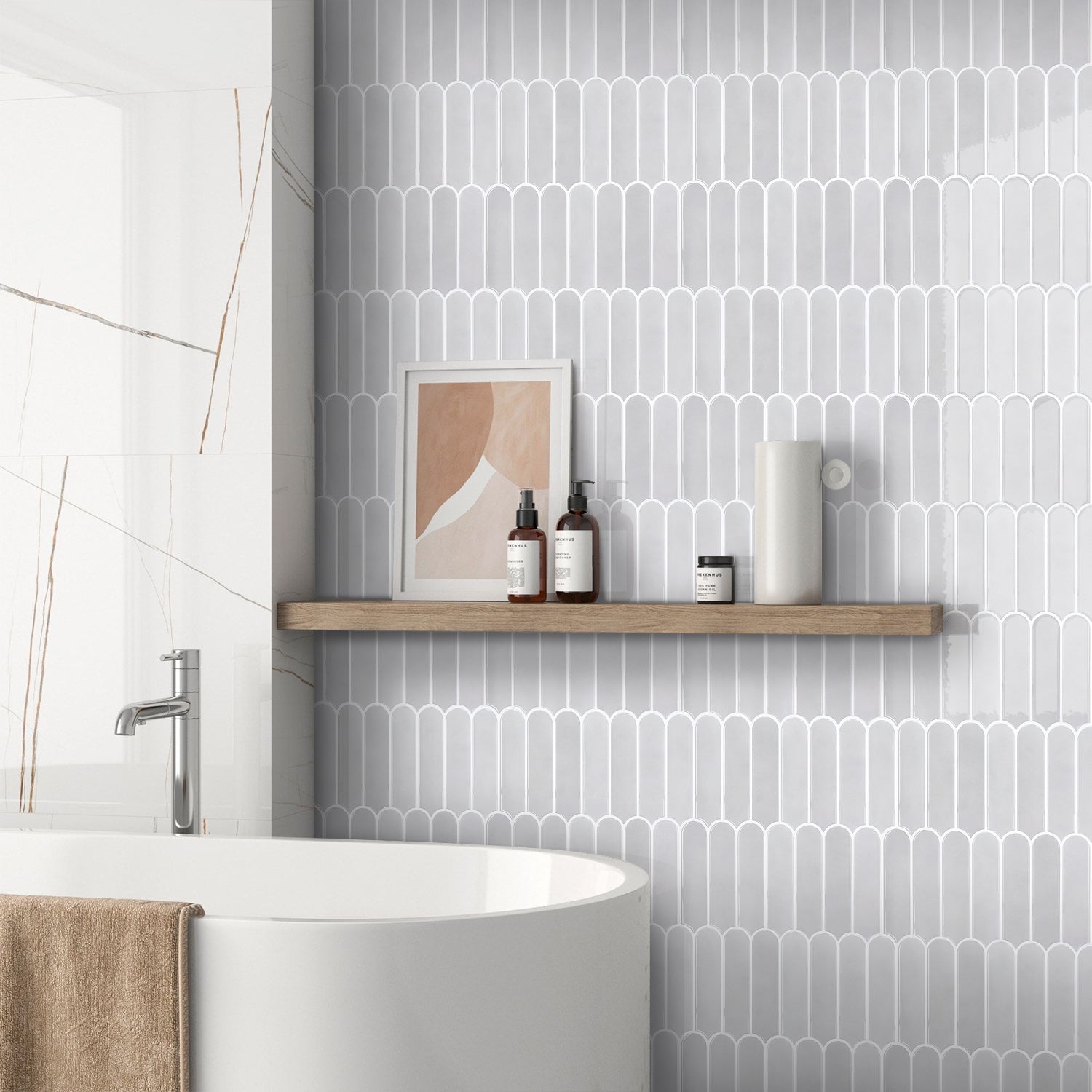 Enhance your space with the timeless elegance of the Mist Gray Fish Scale Peel and Stick Backsplash Tile.